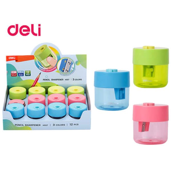 DELI ΞΥΣΤΡΑ ΒΑΡΕΛΑΚΙ ΔΙΠΛΗ ΠΛΑΣΤΙΚΗ 48x48x55.3mm ΑΣΣΟΡΤΙ ΒΙΤΡΙΝΑ . Το αποθηκευτικό αποσπώμενο δοχείο της κρατά τα ξύσματα στη θέση τους. Κατάλληλη για μολύβια 8mm & 12 mm.
